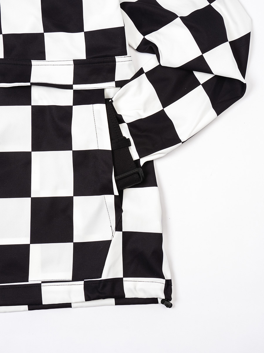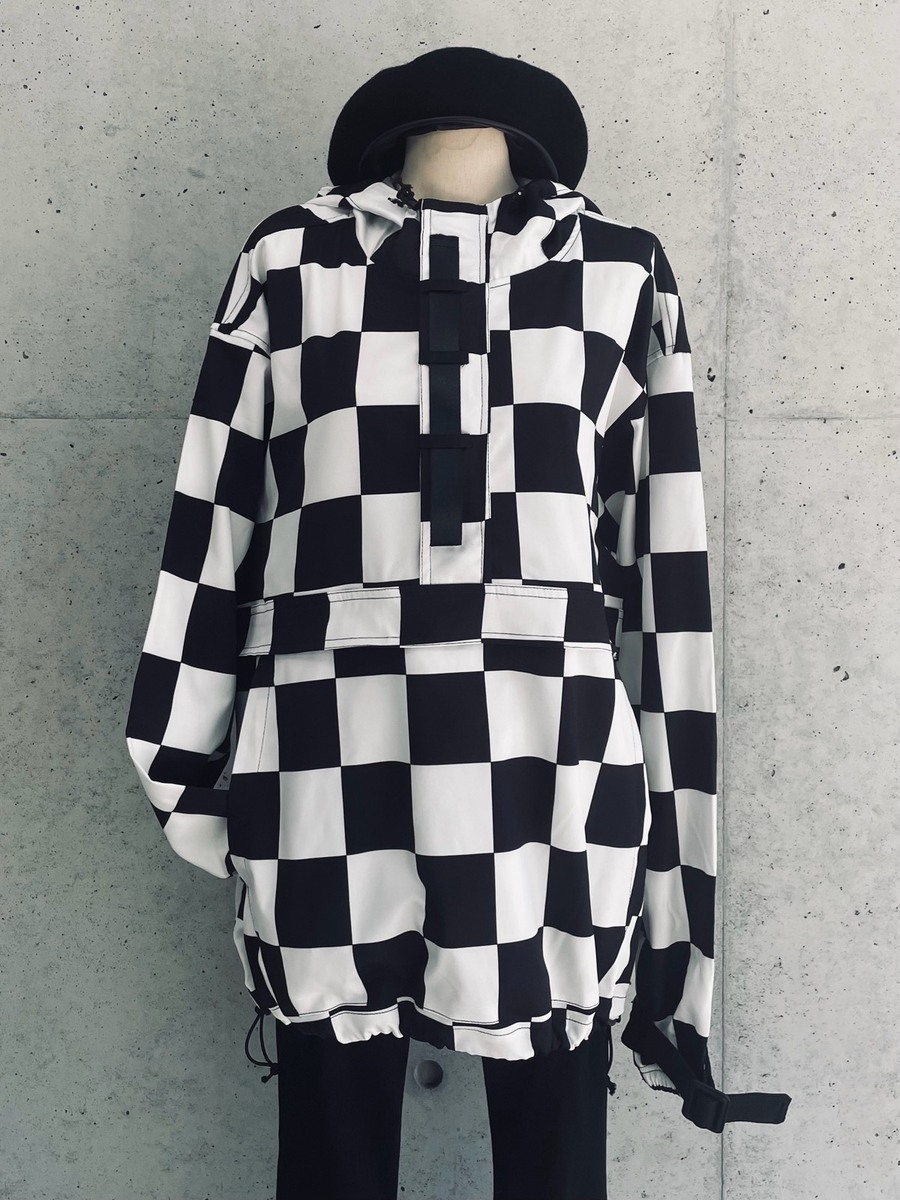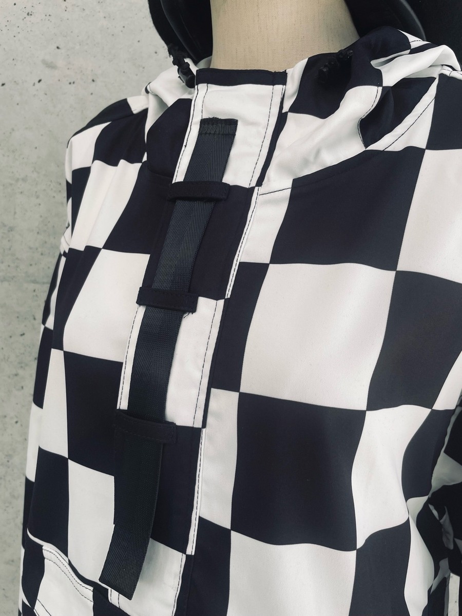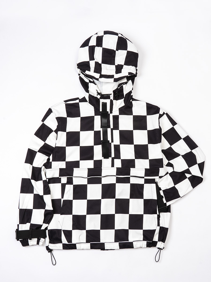 チェッカーフラッグ柄のハーフジップフーディー。