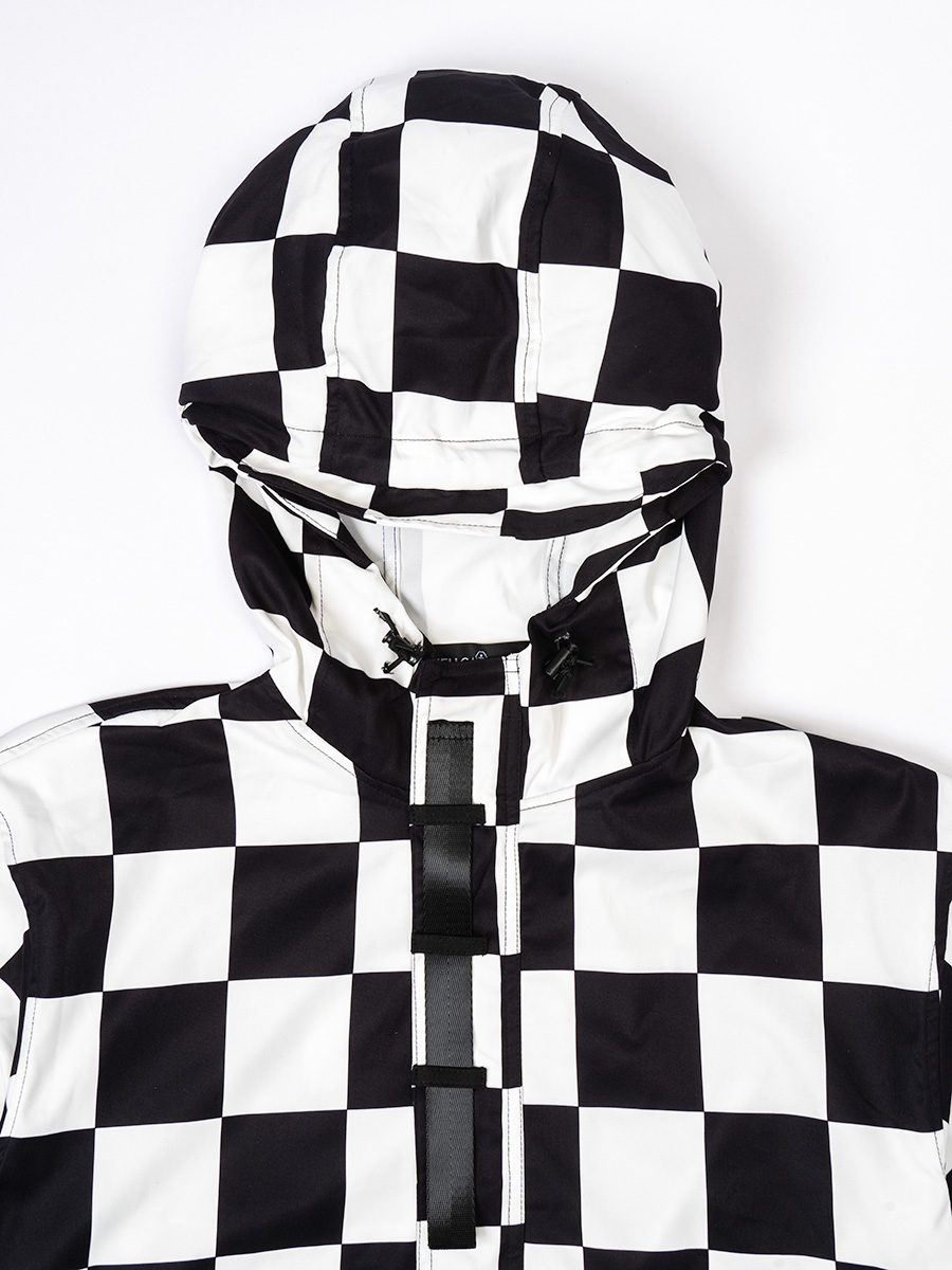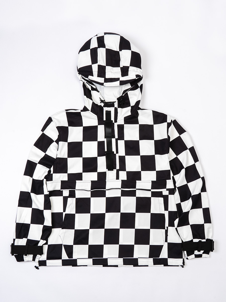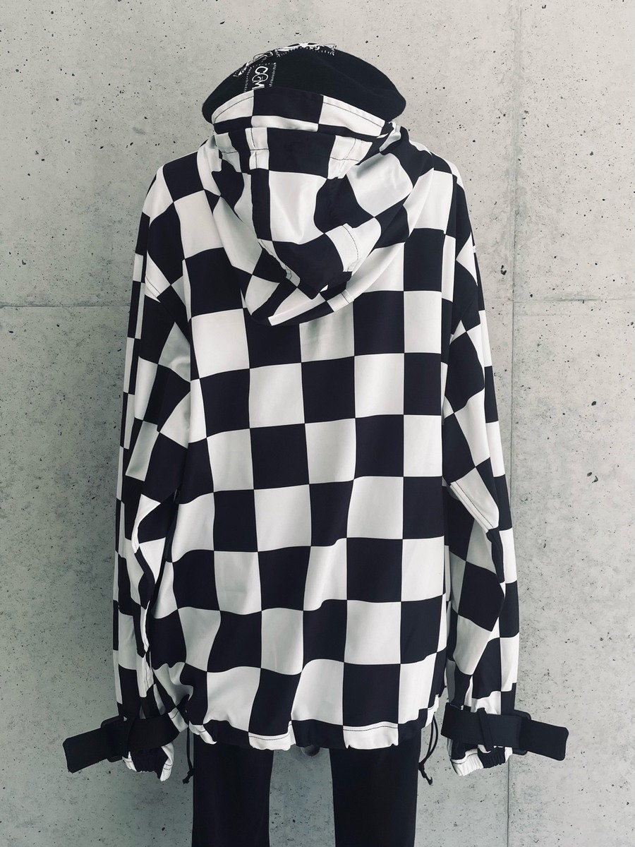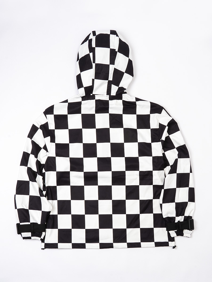 チェッカーフラッグ柄のハーフジップフーディー。