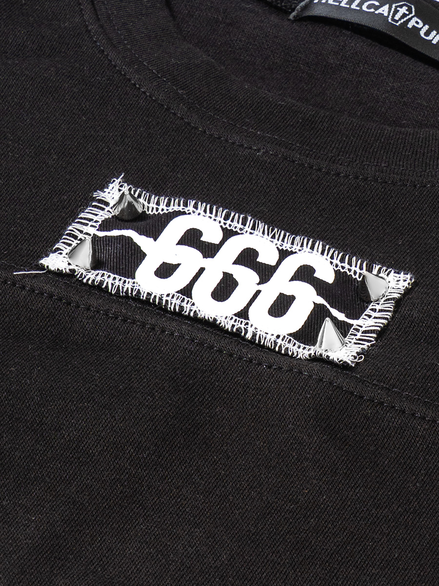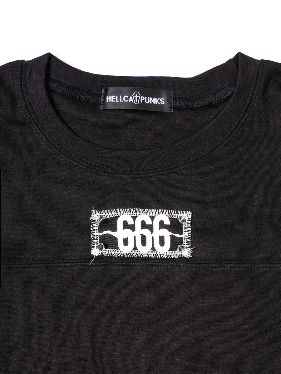 悪魔の数字「666」のパッチがポイントのTシャツ。